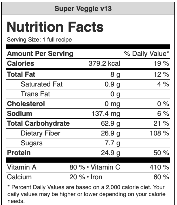 A note on Super Veggie taste. The food I eat is delicious to me; one of the most exciting moments of my day. Both my teenage boys, mother, father, and brother eat the same foods daily and they love them too. When starting, sometimes there is a period of adaptation and some want to play with the recipe and texture.