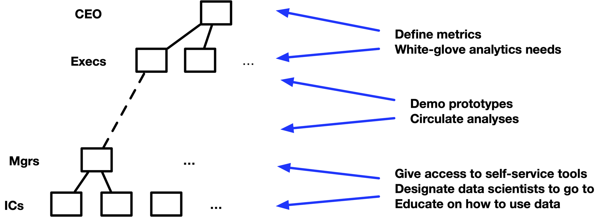 - Watch for a culture of output vs outcomes (eg. PM psyched about delivering 2 days in advance, but not sure about the statistical significance of the uplift)