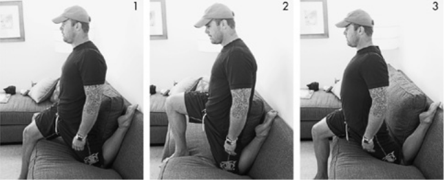 Here, Kelly demonstrates the “super quad” stretch on a couch. Frame 1 is